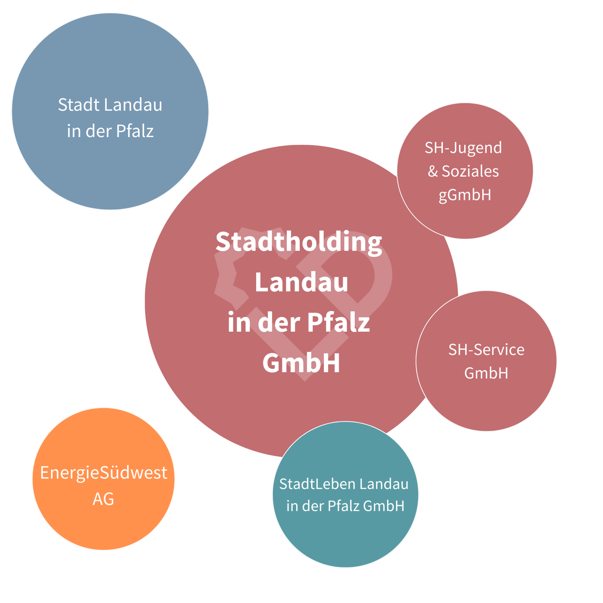 Unser Ziel ist es, das Kultur- und Freizeitangebot Landaus zu fördern, sowie das soziale Zusammenleben zu sichern. Wir verantworten den Betrieb des Freizeitbades LA OLA und des Freibades am Prießnitzweg, der Jugendstil-Festhalle, des Kulturzentrums "Altes Kaufhaus" sowie des städtischen Messegeländes. Außerdem hält die Gesellschaft eine Beteiligung an dem Versorgungsunternehmen EnergieSüdwest AG sowie an der Servicegesellschaft SH-Service GmbH und an der SH-Jugend & Soziales gGmbH, die vier kommunale Kindertagesstätten betreibt. Seit 2026 ergänzt die StadtLeben Landau in der Pfalz GmbH das Unternehmen und zeichnet sich verantwortlich für die Themen Stadtmarketing, Marktwesen, Tourismus und Lebensraumentwicklung.